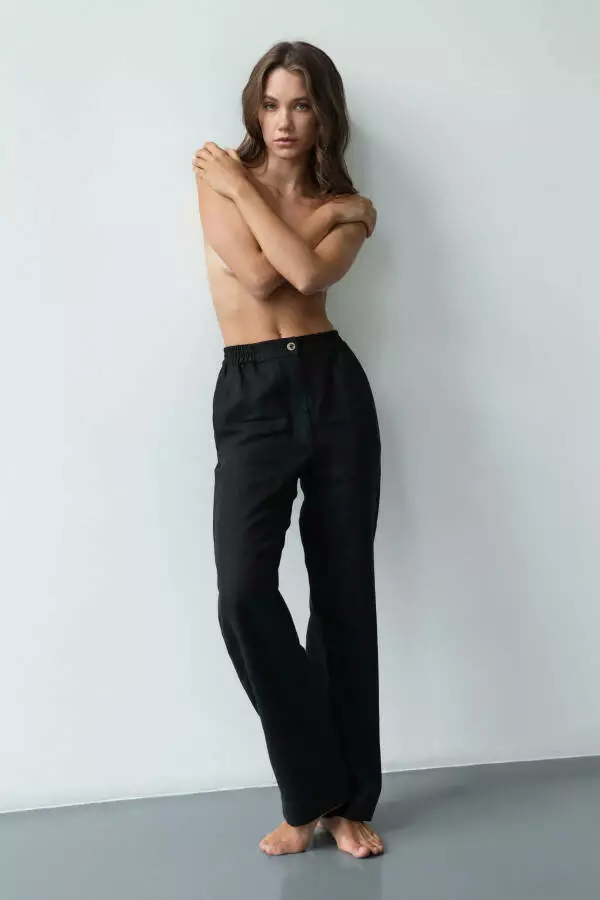 Чорний колір надає штанам універсальності та класичної елегантності. Він легко комбінується з іншими кольорами та стилями, що дозволяє створювати як повсякденні, так і більш формальні образи. Лляні штани в чорному кольорі можна поєднувати з блузами для елегантного вигляду, футболками чи топами для невимушеного стилю або навіть з піджаками, створюючи модний образ для ділових зустрічей. Чорний колір також є практичним вибором для тих, хто хоче мати в гардеробі базовий та універсальний елемент одягу, який завжди буде виглядати доречно.