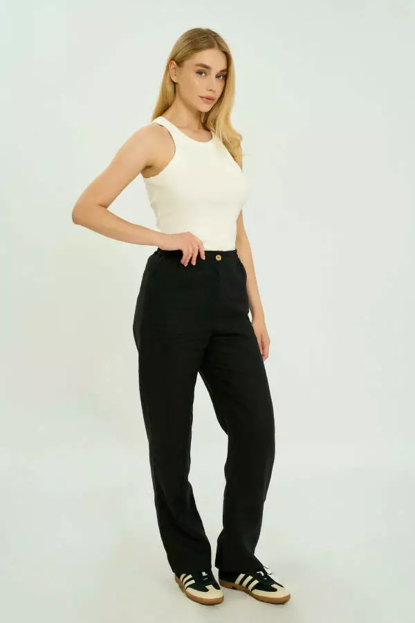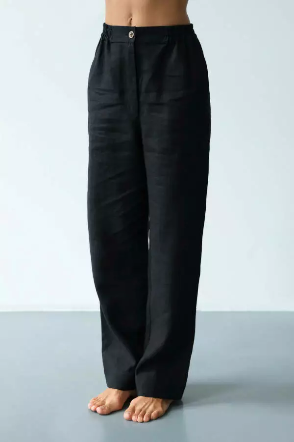 Чорний колір надає штанам універсальності та класичної елегантності. Він легко комбінується з іншими кольорами та стилями, що дозволяє створювати як повсякденні, так і більш формальні образи. Лляні штани в чорному кольорі можна поєднувати з блузами для елегантного вигляду, футболками чи топами для невимушеного стилю або навіть з піджаками, створюючи модний образ для ділових зустрічей. Чорний колір також є практичним вибором для тих, хто хоче мати в гардеробі базовий та універсальний елемент одягу, який завжди буде виглядати доречно.
