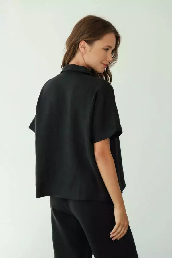 Ця чорна сорочка з коротким рукавом є універсальною річчю, яка легко комбінується з іншими предметами гардеробу. Вона ідеально поєднується з джинсами, класичними брюками або шортами, дозволяючи створювати різні стилі — від офісного до кежуал. Для офіційного образу її можна доповнити спідницею-олівцем або класичними брюками, а для більш повсякденного стилю — шортами чи легінсами. Це дозволяє адаптувати сорочку під будь-який випадок, роблячи її ідеальним вибором для роботи, прогулянок, подорожей чи зустрічей із друзями.