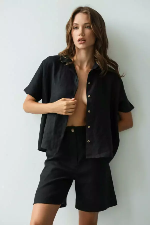 Чорний колір сорочки надає їй універсальності та стриманої елегантності. Це класичний відтінок, який завжди залишається актуальним і легко поєднується з будь-якими іншими кольорами. Чорна лляна сорочка підходить для різних образів — від ділового стилю до повсякденного, від прогулянок до вечірніх виходів. Вона додає будь-якому луку завершеності та витонченості, роблячи образ стриманим і стильним.