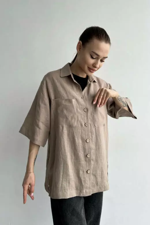 Сорочка жіноча льняна з короткими рукавами на гудзиках, колір кавовий