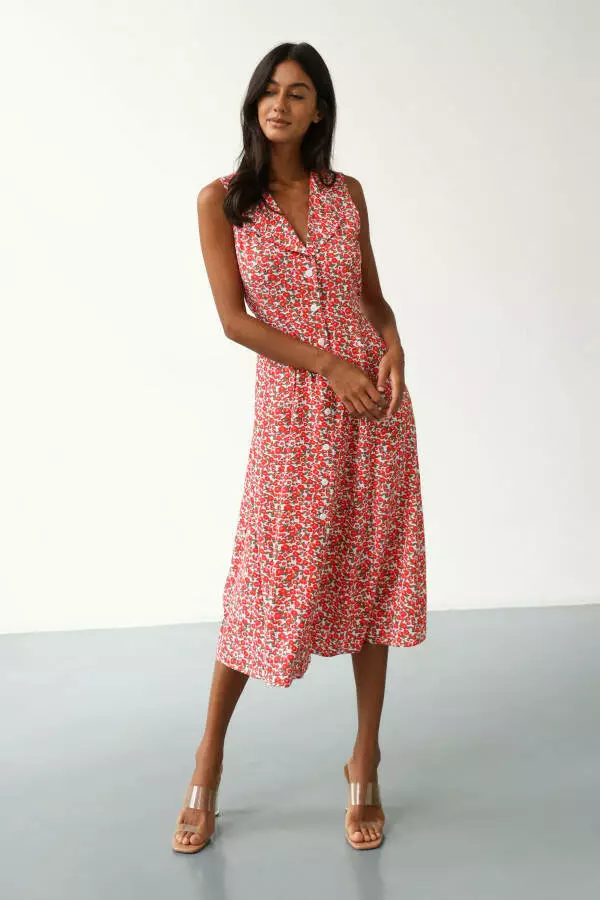 - Тип модели: Сукня сарафан жіноча довга на ґудзиках, принт червоні квіти