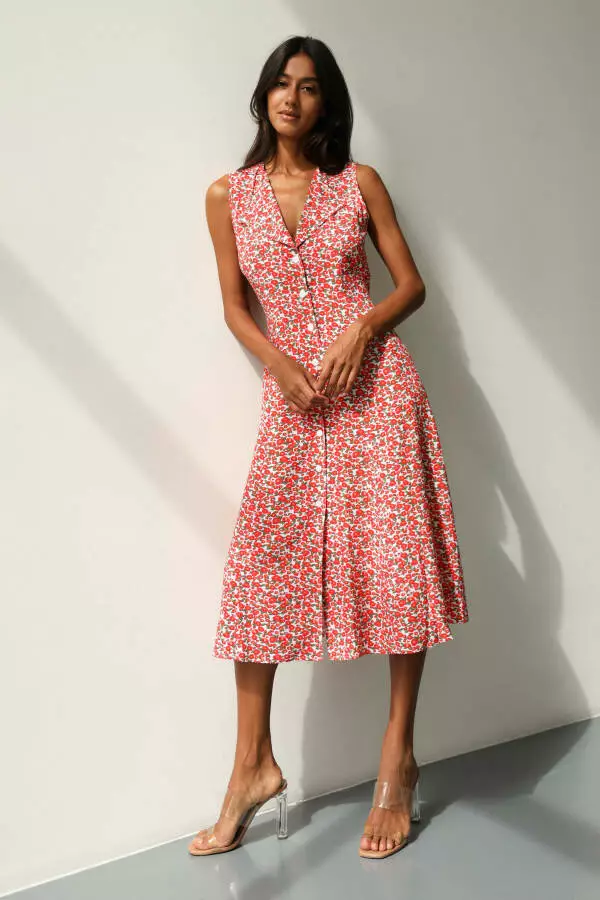 Червоний квітковий принт надає образу особливого шарму та підкреслює жіночність. Яскраві квіткові мотиви додають образу динамічності, роблячи сукню не тільки стильним, а й незабутнім елементом гардеробу. Квітковий принт завжди асоціюється з ніжністю та романтичністю, тому ця сукня – ідеальний вибір для тих, хто любить виділятися та підкреслювати свою індивідуальність. Квіти на сукні створюють відчуття свіжості та тепла, що особливо доречно для літнього сезону.