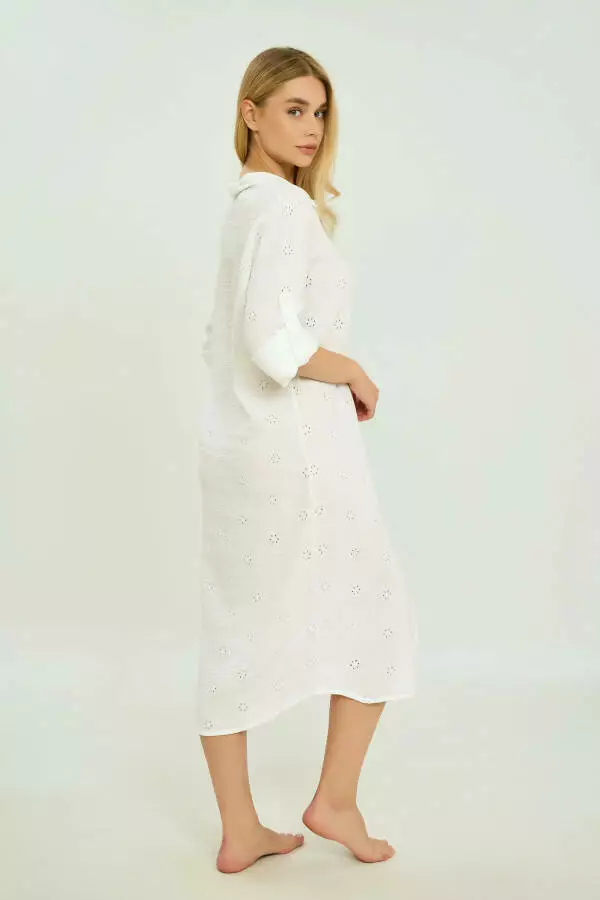 Дизайн туніки вирізняється універсальністю: вона підходить як для пляжного відпочинку, так і для повсякденних прогулянок. Вільний крій забезпечує зручність та легкість рухів, підкреслюючи природну красу силуету. Білий колір надає образу свіжості та елегантності, гармонійно поєднуючись з іншими елементами гардеробу, такими як шорти, спідниці чи купальники.
