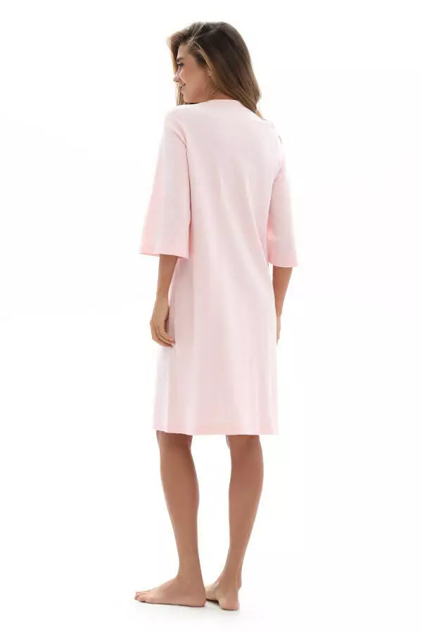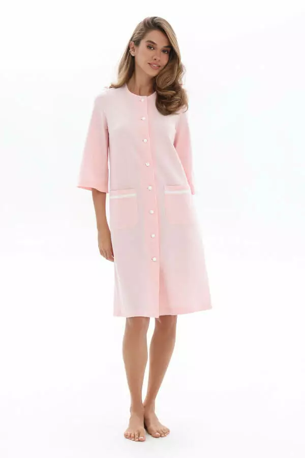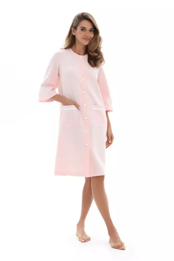 Жіночий халат із вафельного трикотажу поєднує легкість, комфорт і елегантність. Його коротка довжина до колін, рукав 3/4 і вільний крій створюють зручність і свободу рухів у повсякденному носінні. Ніжний рожевий відтінок гармонійно поєднується з делікатним мереживом, додаючи образу романтичності й жіночності. Матеріал приємний на дотик, добре дихає і підходить для будь-якої пори року, особливо весною й літом. Відмінний вибір для домашнього відпочинку, що додає образу стильності й легкості.